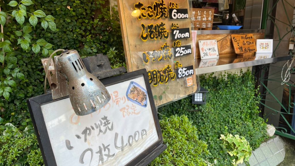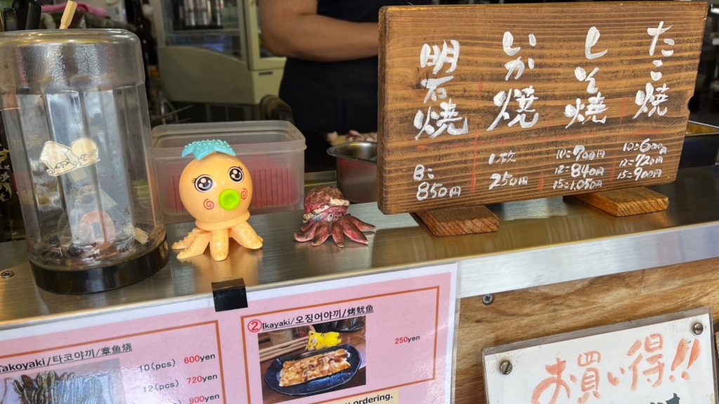 There are around 10 seats for customers, and you can also enjoy drinks and shaved ice. In addition to takoyaki, they offer other items like Akashiyaki and grilled squid. Especially the Akashiyaki, which is dipped in a sweet broth with the distinctive flavor of bonito. It was delicious and unique to Osaka.